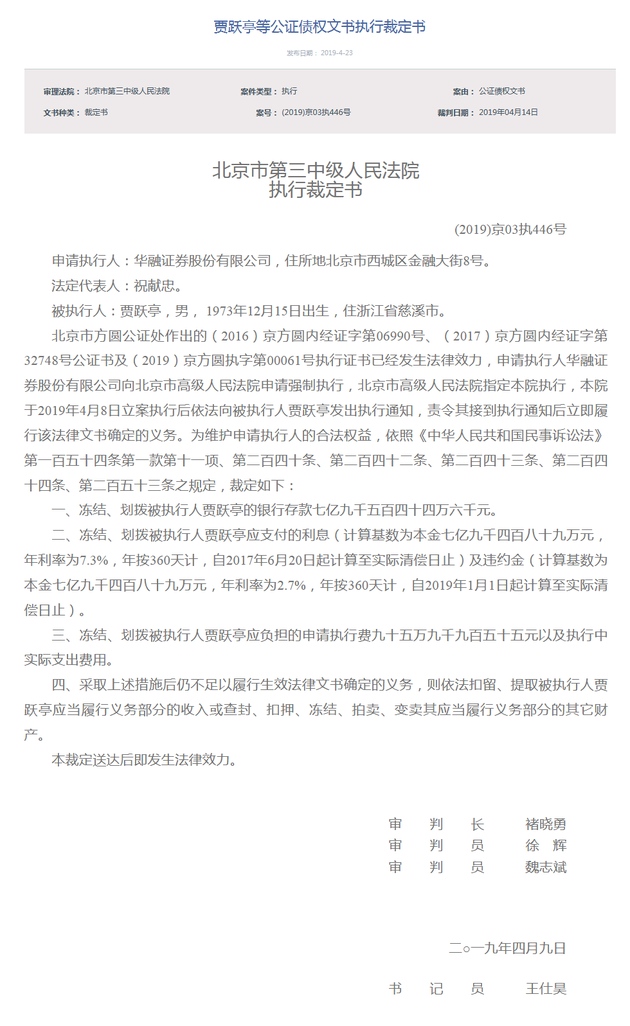 新浪科技讯 4月24日消息,据北京法院审判信息网消息,北京市第三中级人民法院于4月9日对华融证券股份有限公司与贾跃亭之间的债权纠纷作出执行裁定。