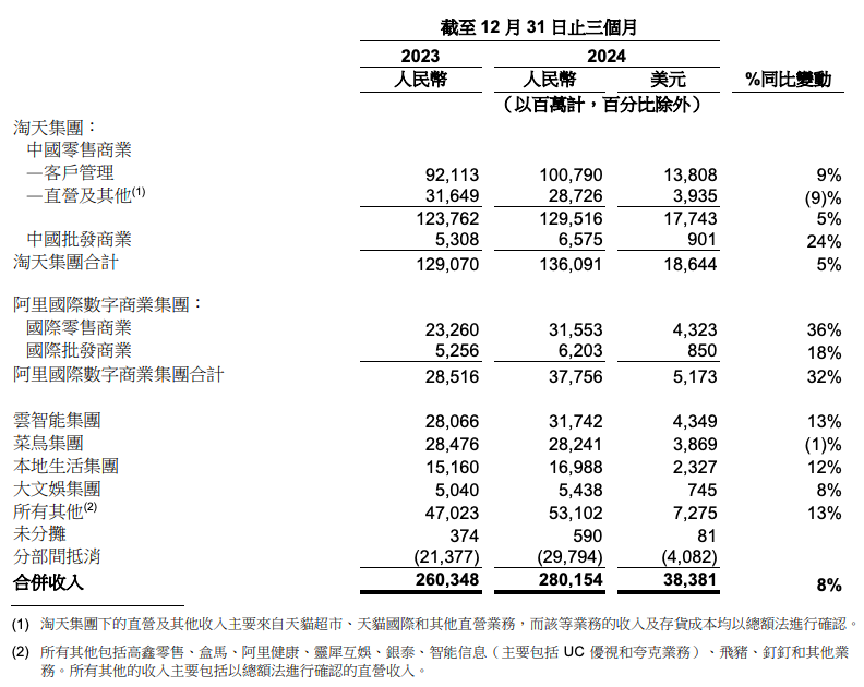 其中,阿里巴巴云智能集团(CIG)(云智能集团,包括阿里云、钉钉和其他业务)的营收为317.42亿元(约合43.49亿美元),同比增长13%;调整后EBITA达31.38亿,同比增长33%。