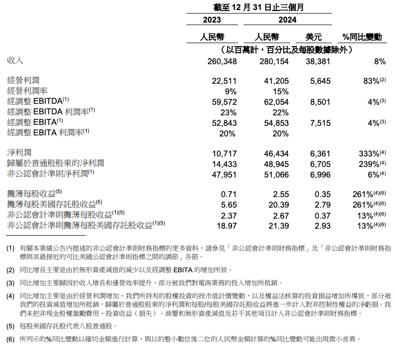 【TechWeb】2月21日消息,阿里巴巴集团发布了截至2024年12月31日的2025财年第三财季财报。该季度,阿里营收2801.54亿元,同比增长8%;净利润为464.34亿元,同比增长;不按美国通用会计准则,净利润为510.66亿元,同比增长6%。