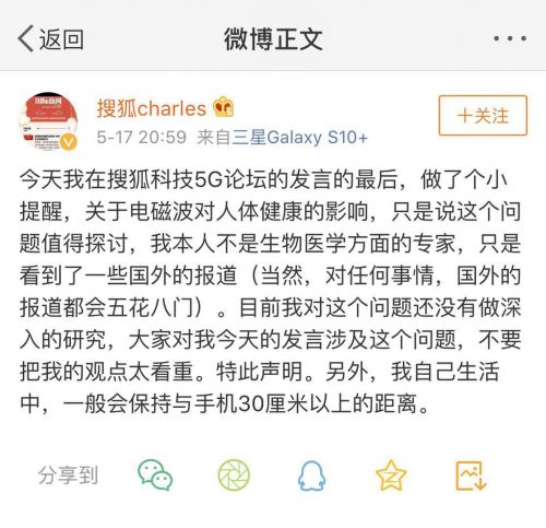 原文如下:今天我在搜狐科技5G论坛的发言的最后,做了个小提醒,关于电磁波对人体健康的影响,只是说这个问题值得探讨,我本人不是生物医学方面的专家,只是看到了一些国外的报道(当然,对任何事情,国外的报道都会五花八门)。目前我对这个问题还没有做深入的研究,大家对我今天的发言涉及这个问题,不要把我的观点太看重。特此声明。另外,我自己生活中,一般会保持与手机30厘米以上的距离。