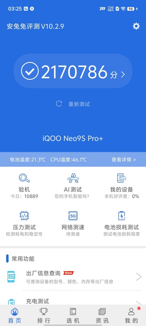从结果来看,iQOO Neo9S Pro+的安兔兔跑分达到了2170786分,这个成绩已经可以达到当前安卓阵营性能天花板,可谓是当下当之无愧的性能王,足以应对日常各种复杂的使用场景和市面上绝大部分的游戏。