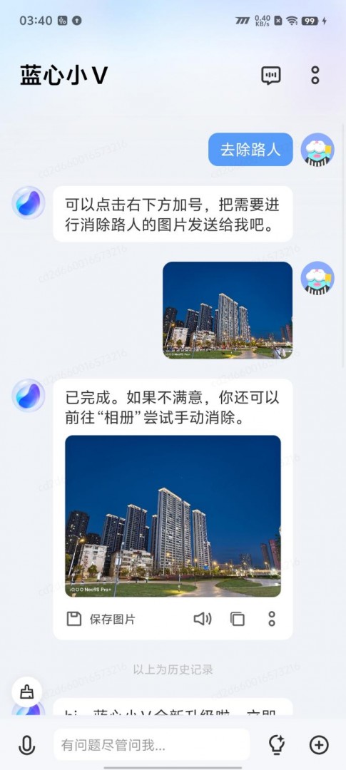 除了镜头和影像算法本身,iQOO Neo9S Pro+还支持了包括风格化优化、艺术字生成、去除手写等AI功能多种AI功能,其中最受大家欢迎的就是AI消除功能了。我们只需在屏幕右侧激活“蓝心小V”,发送“去除路人”指令,即可轻松实现画面中路人的消除,效果非常出色。
