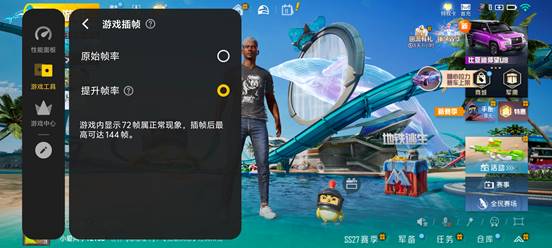 首先不得不提的,就是视效满格的超帧功能。在自研电竞芯片Q1的加持下,该机可对于原生并不支持高帧率的游戏可以通过插帧的方式来提升流畅度,最高可以插帧至144帧,可以有效降低处理器的画面渲染压力,带来更加流畅的画面的同时,也能降低功耗、减少发热。
