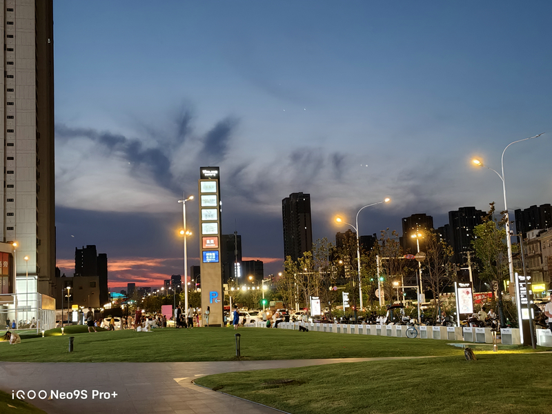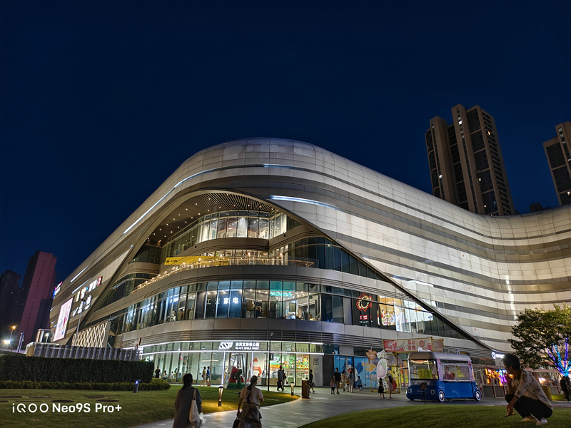 而在夜晚的拍照场景中,iQOO Neo9S Pro+这颗旗舰级主摄的表现同样令人惊喜,暗处细节丰富,同时噪点控制得不错,明亮多彩的灯光也没有严重的过曝和失真,给人的第一观感同样不错。同时蓝厂最新夜景算法进一步带来了清晰度的提升,而夜景的高光压制等整体效果也有一定提升,整个夜晚天空的颜色看上去非常纯净,并没有出现明显的噪点,并且楼顶上的轮廓都非常清晰,让氛围感夜色大片可以更加轻松地呈现。