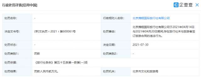 此前该公司也曾因未签订旅游合同被处罚,北京携程国际旅行社有限公司新增行政处罚,处罚结果为罚款2万元。