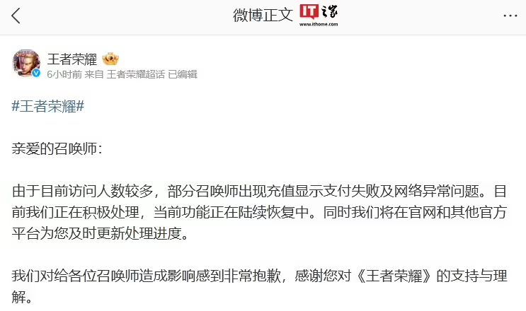 IT之家 1 月 28 日消息,腾讯旗下手游《王者荣耀》今日 0 点正式上架了蛇年限定皮肤,全套售价超 500 元(优惠后价格)。游戏官方在凌晨紧急发布公告,称由于访问人数较多,部分召唤师出现充值显示支付失败及网络异常问题。目前正在积极处理,功能正在陆续恢复中。