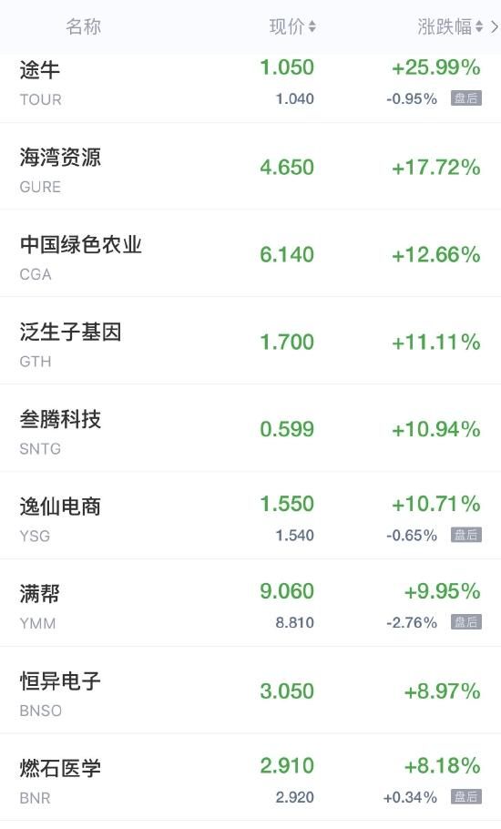 途牛涨近26%,逸仙电商涨超10%,满帮涨近10%,凤凰新媒体涨超7%,洋葱集团涨超6%,中通涨超5%,一起教育涨超4%,叮咚买菜涨近4%,搜狐涨超3%,老虎证券涨超2%,富途控股、新东方、好未来、万物新生、贝壳涨超1%,网易、开心汽车涨近1%。