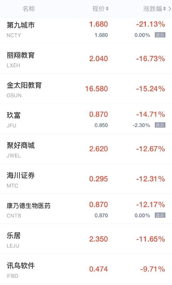 乐居跌超11%,每日优鲜跌超9%,百世集团跌近8%,虎牙跌超7%,网易有道、雾芯科技跌超6%,爱奇艺、云米科技跌超5%,迅雷跌超4%,优信、蘑菇街、寺库跌超3%,涂鸦智能跌近3%,欢聚集团、唯品会、知乎、阿里巴巴、拼多多、腾讯ADR、新氧、陆金所控股跌超2%,哔哩哔哩、百度、小鹏汽车、携程、世纪互联跌超1%,京东、斗鱼、腾讯音乐、36氪、荔枝跌近1%。
