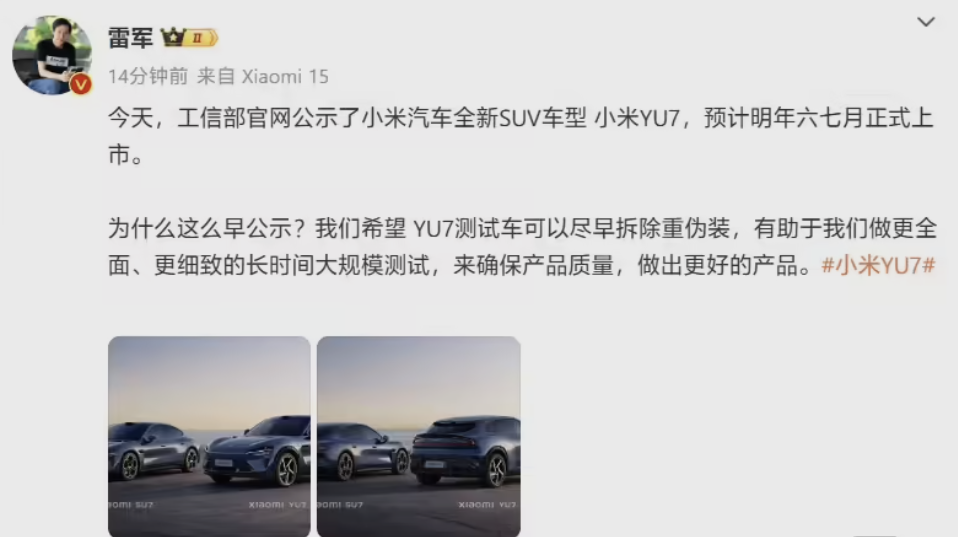 小米YU7测试车提前公示,雷军发文解释原因快讯