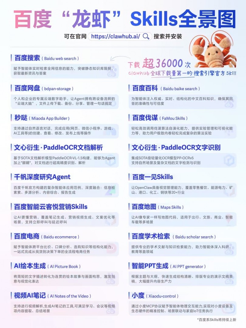全球下载量第一!百度搜索Skill获龙虾官方社区推荐快讯