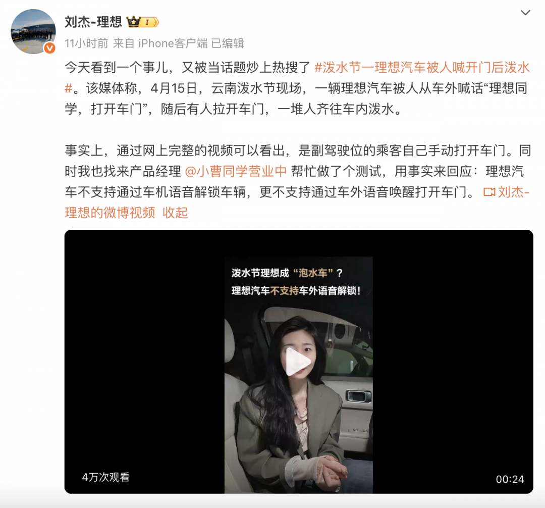 理想汽车辟谣:泼水节车辆被车外语音解锁不实,车门系手动开启汽车