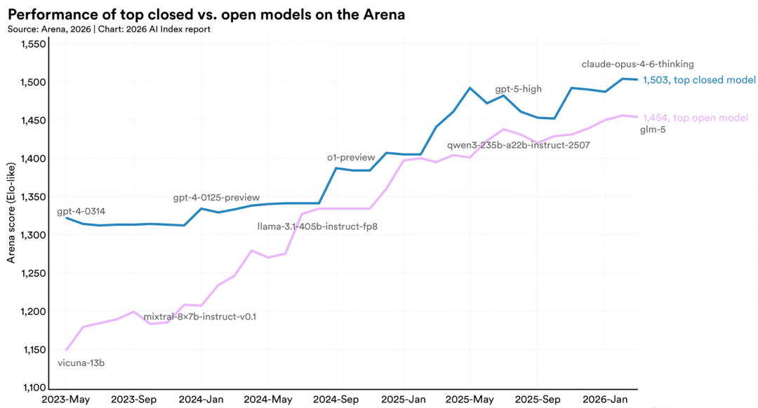 另一个值得关注的维度是开源模型与闭源模型的竞争。报告发现,开源模型与闭源模型的性能差距在2025年重新拉大。截至2026年3月,顶级闭源模型领先顶级开源模型3.3%,而2024年8月这一差距仅为0.5%。竞技场排行榜前十名中,目前有六个是闭源模型。这意味着,虽然中美顶尖模型整体差距消失,但中国在开源领域的进展,如DeepSeek的开源模型,与美国闭源巨头的竞争仍在持续。