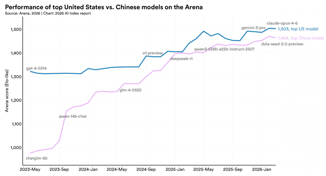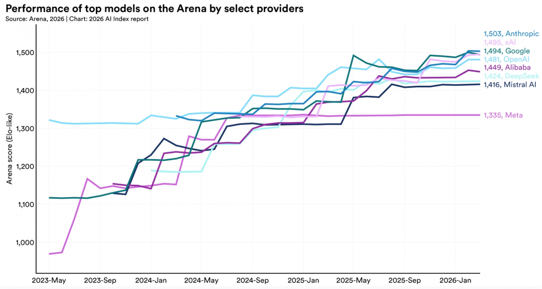 根据报告中的竞技场排行榜(人类投票的Elo评级),截至2026年3月,顶级模型的评分高度收敛:Anthropic(1503分)、xAI(1495分)、Google(1494分)、OpenAI(1481分)、阿里巴巴(1449分)、DeepSeek(1424分)均位于第一梯队,分差已缩小至25分以内。其中,中国公司阿里巴巴和DeepSeek已稳稳跻身全球前六。
