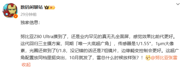 努比亚Z80 Ultra影像规格曝光:10月发 同期唯一大底超广角快讯