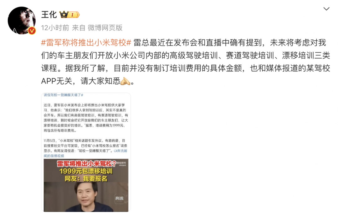 雷军将推小米驾校?王化:尚未制订培训具体费用