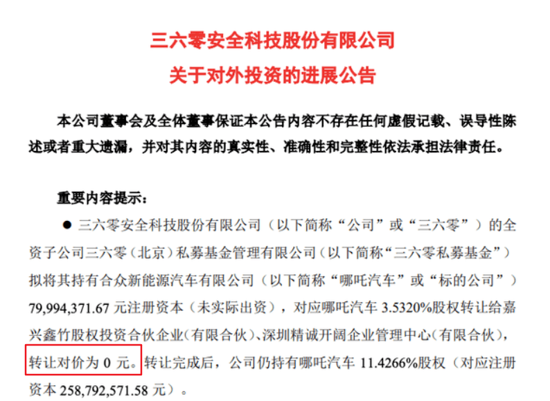 前两天 360 发了个公告说,原本准备增资哪吒汽车的 10 亿元收回,而且要把这部分股权 0 元转让了。