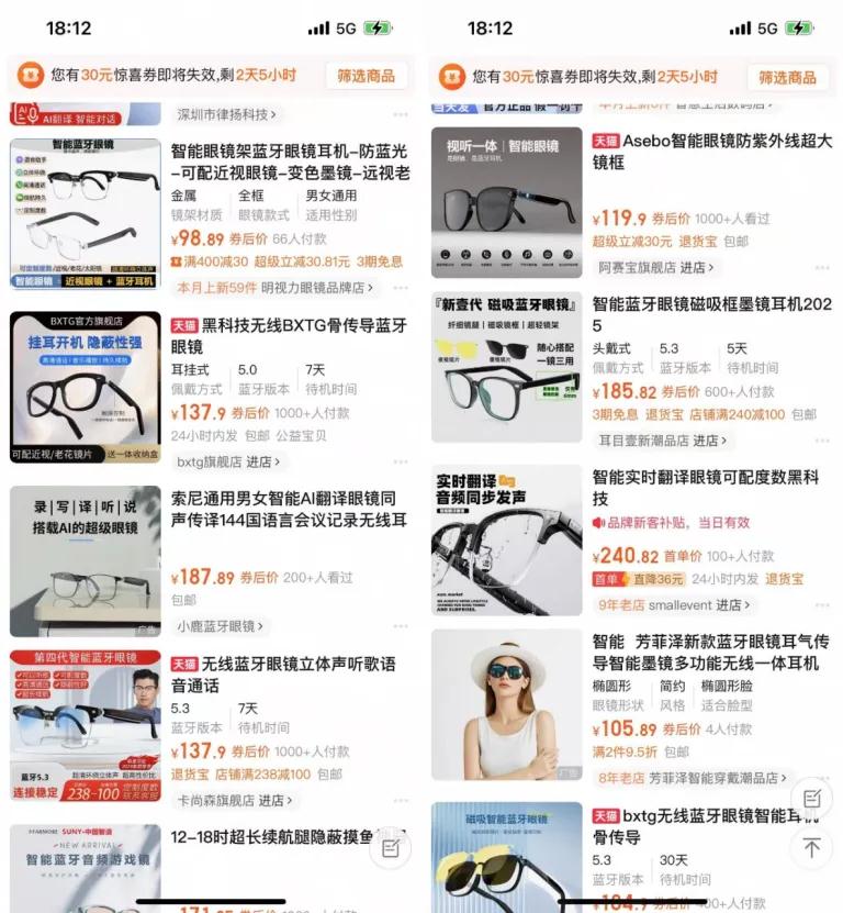 事实上,AI眼镜的硬件门槛不高,很多零部件都已经是成熟模块,在电商平台上甚至还有不少百元以内的智能眼镜,具备了拍照、录像等简单功能。