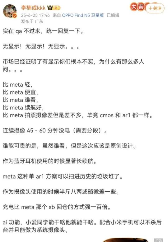 魅族前高管李楠通过社交媒体表达了对小米AI眼镜的看法,他认为小米AI眼镜在技术平台、充电续航等体验上碾压Meta,但AI功能主要依赖小爱同学,整体AI能力有限。