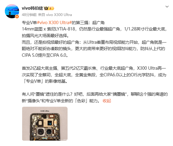 vivo X300 Ultra将首发史上最强超广角:配备1/1.28英寸大底+CIPA 6.0防抖快讯