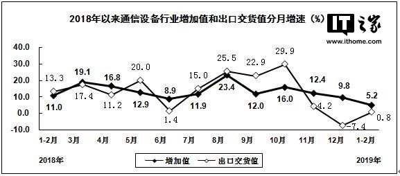 日前,工信部发布《2019年1-2月电子信息制造业运行情况》,文件显示,今年1至2月份,我国通信设备制造业增加值同比增长5.2%,出口交货值同比增长0.8%。主要产品中,手机产量同比下降12.3%,其中智能手机产量同比下降12.4%。1至2月,通信设备制造业营业收入同比增长4.6%,利润同比增长55.8%。