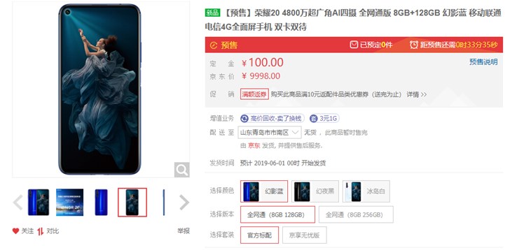 荣耀20线上线下同步开启预售:魅眼全面屏+后置四摄快报