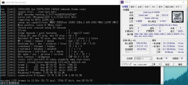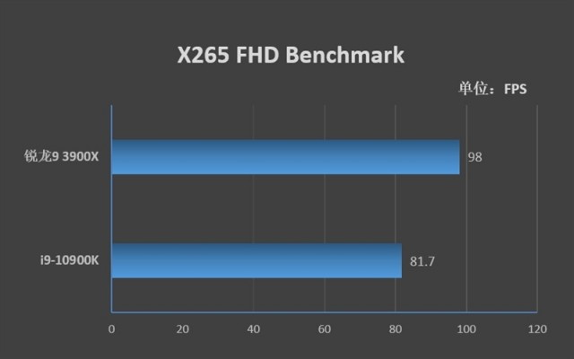 在X265 FHD Benchmark中,锐龙9 3900X能够领先i9-10900K 20%左右。
