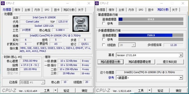 i9-10900K单核分数为614,多线程分数为7500。