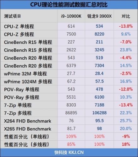 在单线程性能方面,i9-10900K比锐龙9 3900X多了65pps,领先12%;到了多线程这里,锐龙9 3900X能够领先对手10%。