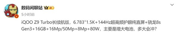 iQOO Z9 Turbo长续航版曝光:容量增大至7000mAh 还有80W快充快讯