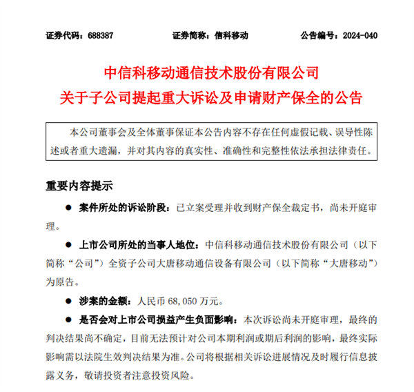 11月4日消息,日前,信科移动发布公告称,其全资子公司大唐移动因与展讯通信(上海)有限公司的合同纠纷,向北京市海淀区人民法院提起诉讼,并申请财产保全。