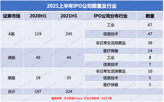 具体来看,2021年上半年,共有245家公司登陆A股,按照GICS行业分类,主要集中在工业(67家)、信息技术(47家)、非日常生活消费品(39家)和原材料(33家)几大行业。