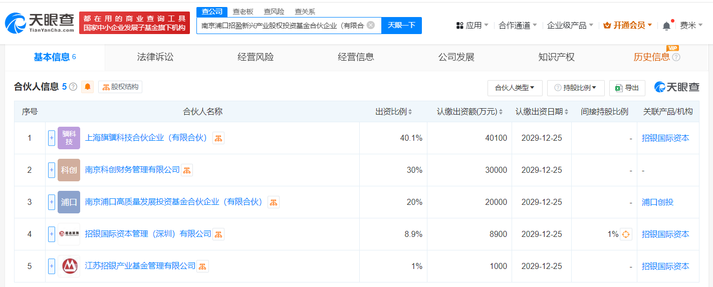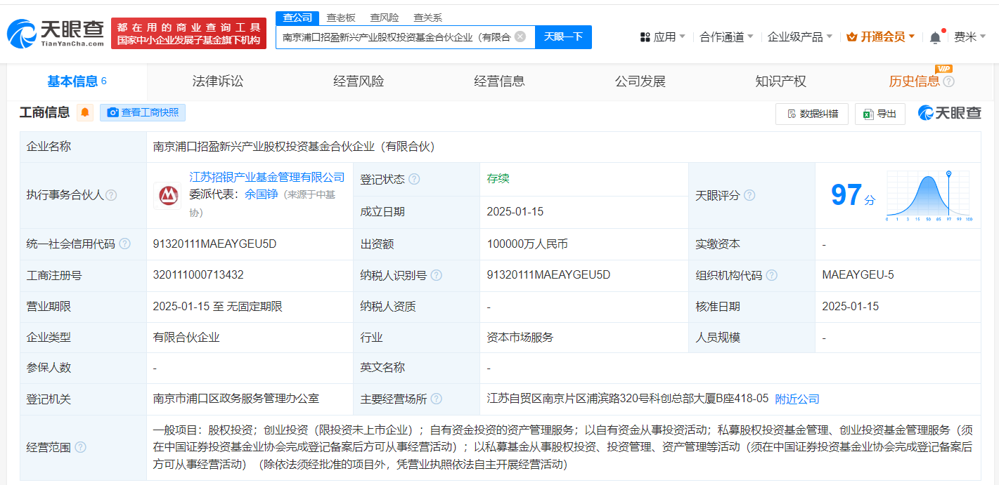 天眼查App显示,近日,南京浦口招盈新兴产业股权投资基金合伙企业(有限合伙)成立,执行事务合伙人为江苏招银产业基金管理有限公司,出资额10亿人民币,经营范围为股权投资,创业投资,自有资金投资的资产管理服务,以自有资金从事投资活动,私募股权投资基金管理,创业投资基金管理服务,以私募基金从事股权投资、投资管理、资产管理等活动。合伙人信息显示,该基金由招银金融旗下上海旗骥科技合伙企业(有限合伙)、招银国际资本管理(深圳)有限公司、江苏招银产业基金管理有限公司以及科创财务管理有限公司、南京浦口高质量发展投资基金合伙企业(有限合伙)共同出资。