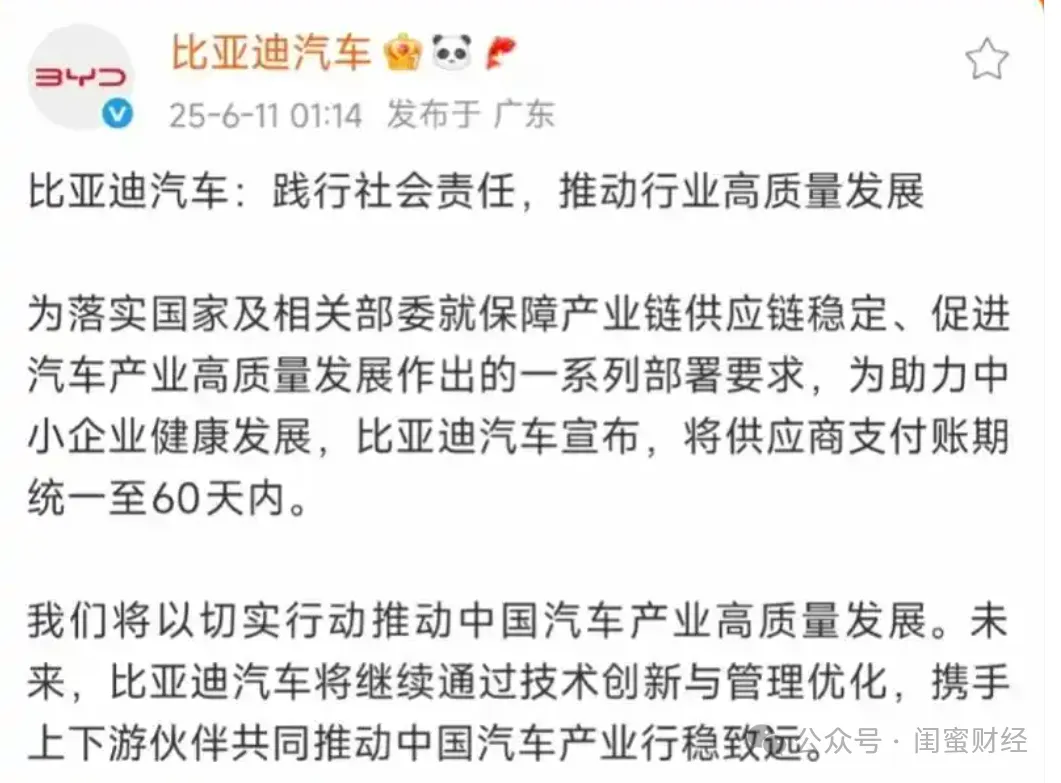 2025年6月,新修订的《保障中小企业款项支付条例》正式实施,明确要求大型车企自货物交付之日起60日内支付中小企业款项。