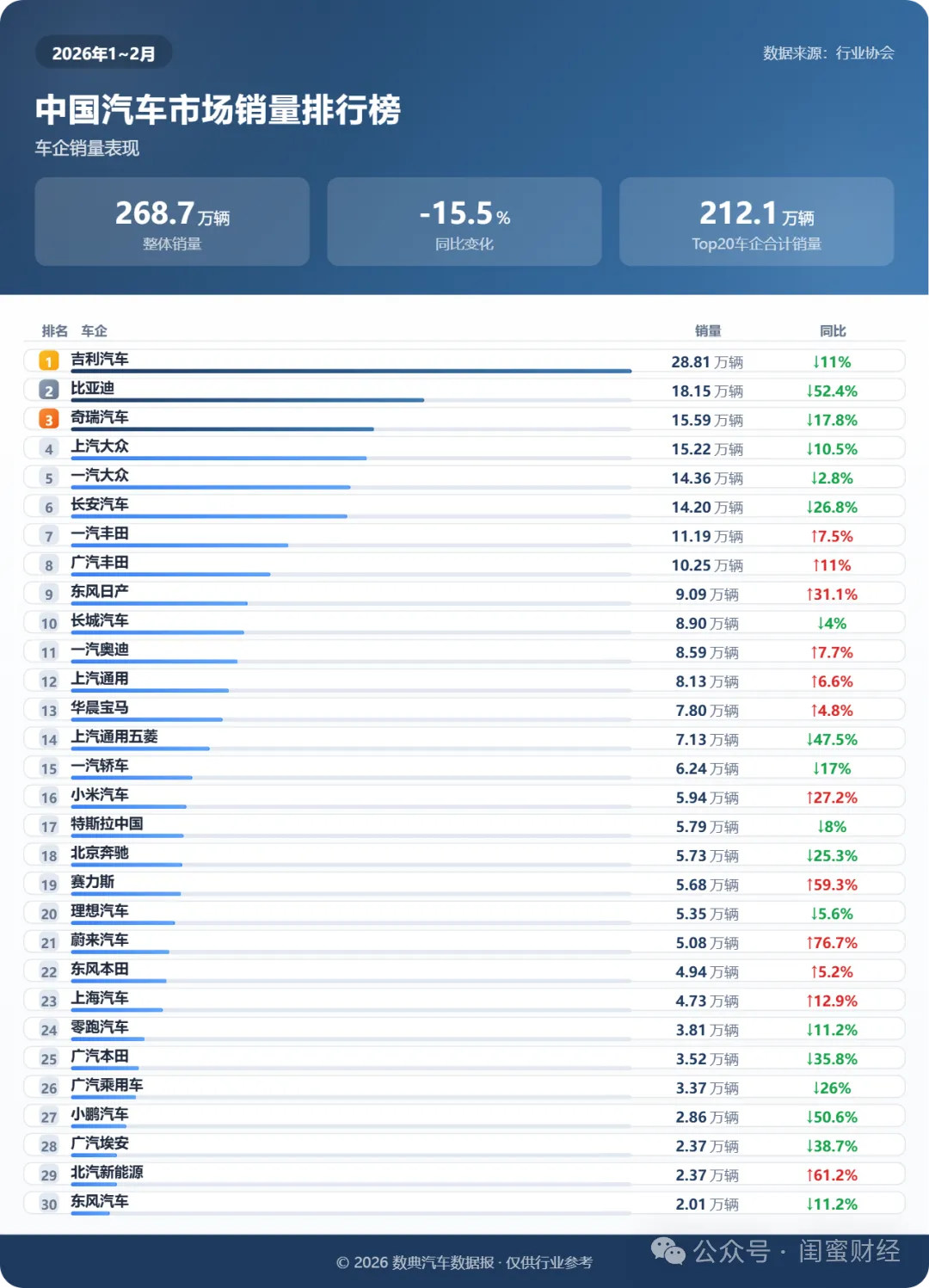 2026年开局,比亚迪似乎也是压力有点大:丢掉了长期占据的车企销量冠军位置,前两个月在国内的累计销量被吉利汽车超越。尤其1月份国内上险量同比暴跌62%,市场排名滑落至第四位。