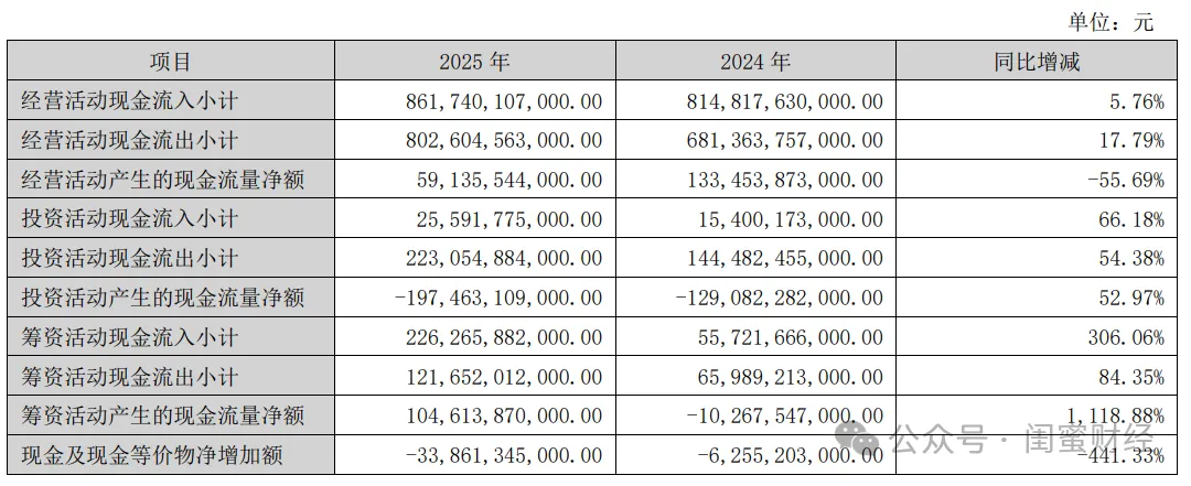 筹资活动现金流这边比亚迪增速有点猛:从2024年的-102.68亿元猛增到2025年的+1046.14亿元。