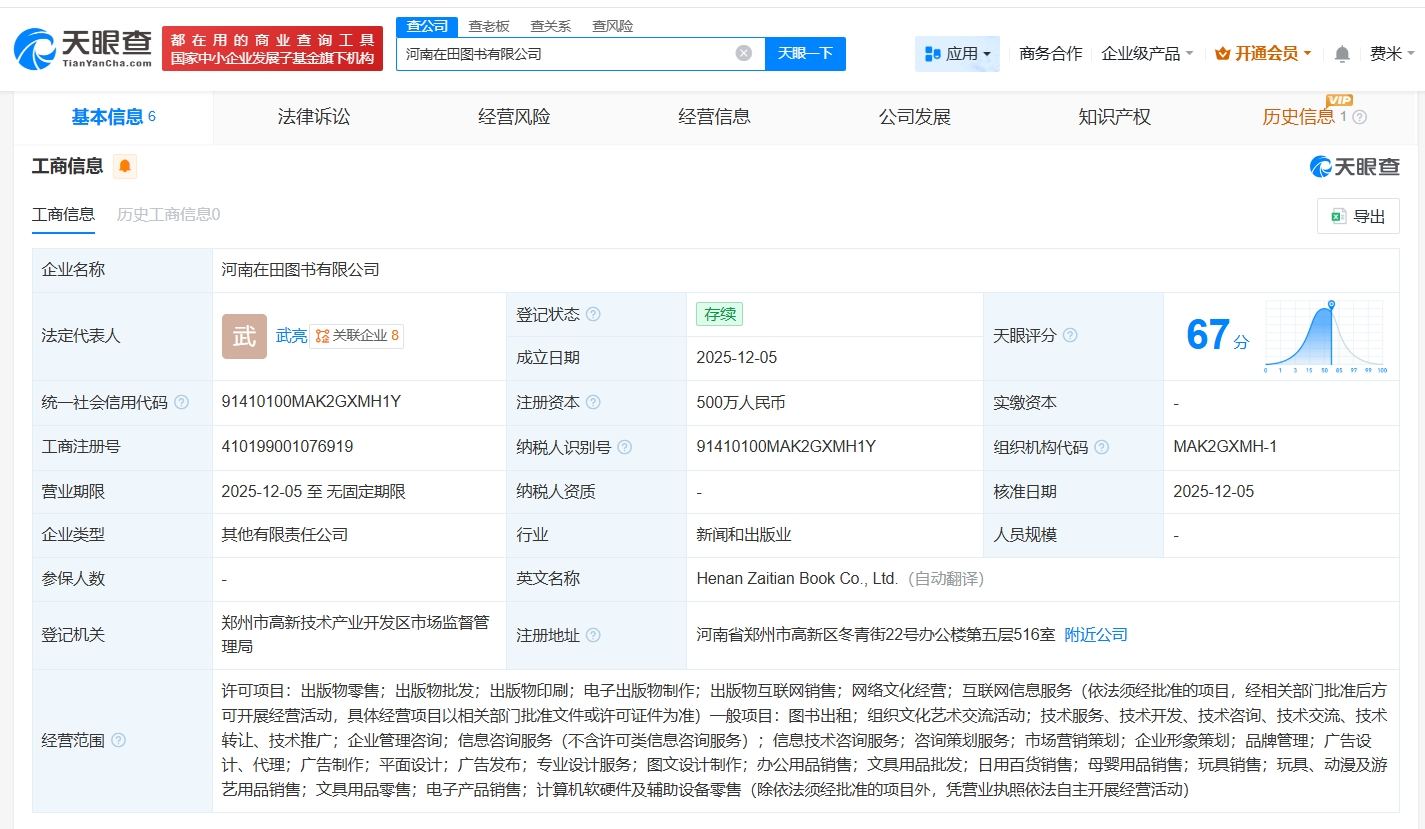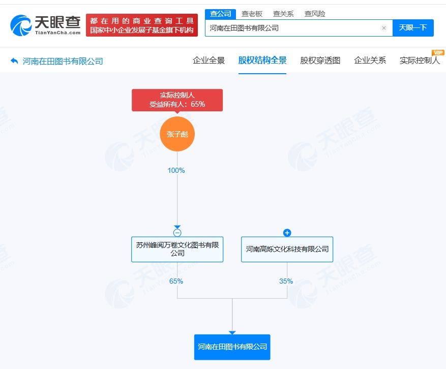 天眼查App显示,近日,河南在田图书有限公司成立,法定代表人为武亮,注册资本500万人民币,经营范围包括出版物零售、出版物批发、出版物印刷等,由张雪峰(张子彪)全资持股的苏州峰阅万卷文化图书有限公司、河南高烁文化科技有限公司共同持股。