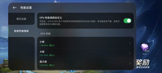 值得注意的是,该机还搭载了极客性能面板2.0,在常规预设模式之上,用户可自定义调节CPU各核心的频率上限,超大核3.2GHz满频能通过自定义来跑满,彻底释放它的极致性能。