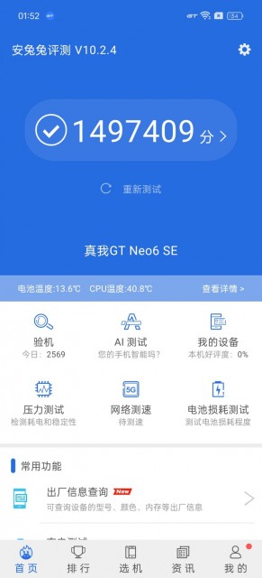 从结果来看,真我GT Neo6 SE的安兔兔跑分为1497409分,性能表现相当出色,同时辅以高达16GB的LPDDR5X内存和512GB的UFS 4.0存储,是同价位性能最强大的手机。