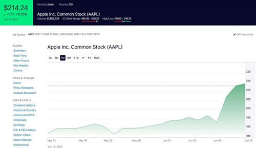 周四美国股市收盘时,苹果报214.24美元,较前一交易日收盘时的213.07美元上涨1.17美元,涨幅为0.55%,市值增至32851.74亿美元。
