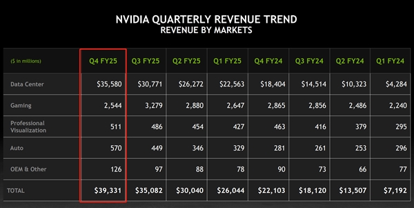 数据显示,英伟达2025财年第四季度营收393亿美元,比去年同期增长78%,其中数据中心业务收入为356亿美元,比去年同期增长93%;第四财季净利润220.91亿美元,同比增长80%。