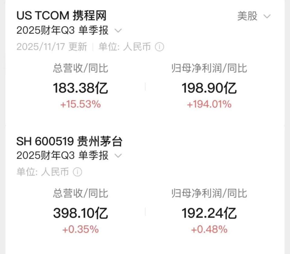 2025年三季度,携程录得归母净利润198.9亿元,小幅超过同期贵州茅台192.24亿元的盈利,一时间“利润高过茅台”的说法传遍全网。