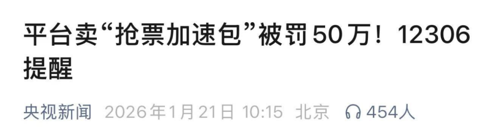 而在此前的全国首例虚假抢票案中,涉事平台正是因为将12306免费候补功能包装成付费抢票服务,被认定构成虚假宣传,违反《反不正当竞争法》,被处以50万元的顶格罚款。