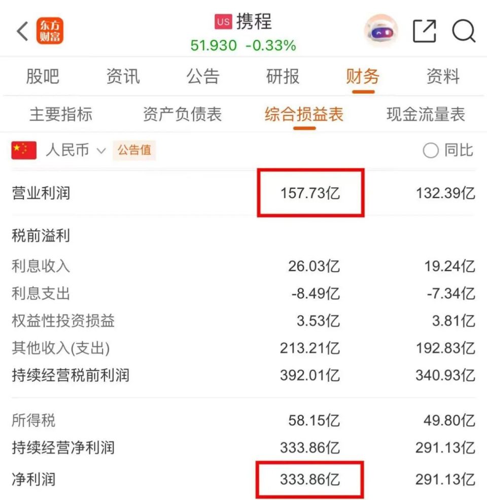 2025年全年,携程334亿的净利润里,投资收益占比近60%,真正反映主业盈利能力的营业利润仅为157.73亿元,和贵州茅台全年近千亿的净利润规模完全不在一个量级。
