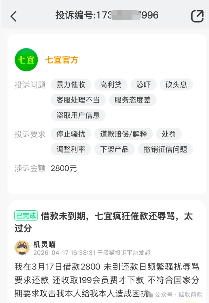 逾期首日就被短信恐吓、外卖员上门电话施压;未到还款日便遭频繁辱骂催收,还被强制收取会员费才能下款。近期,黑猫投诉平台接连出现针对七宜借款的投诉,直指其催收行为突破法律底线、收费模式涉嫌违规,在网贷行业强监管持续收紧的背景下,此类乱象仍屡禁不止,折射出部分平台合规意识淡薄与行业治理的深层难题。
