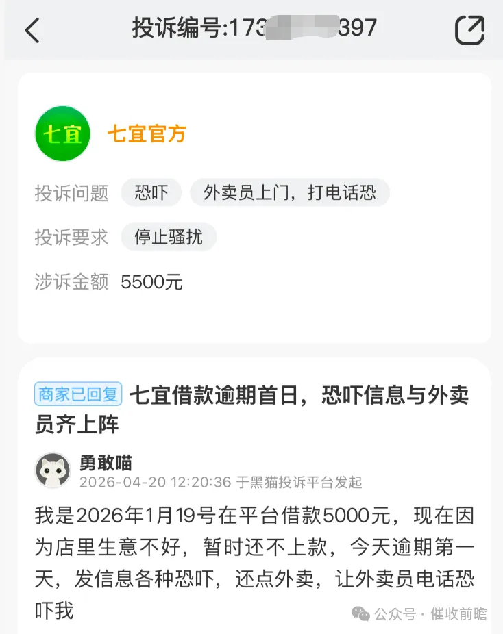 2026 年 4 月,有用户投诉在七宜借款 5000 元,因经营周转困难逾期首日,便收到多条恐吓信息,平台还通过点外卖方式,让外卖员致电进行言语威胁,严重干扰正常生活,涉诉金额达 5500 元。