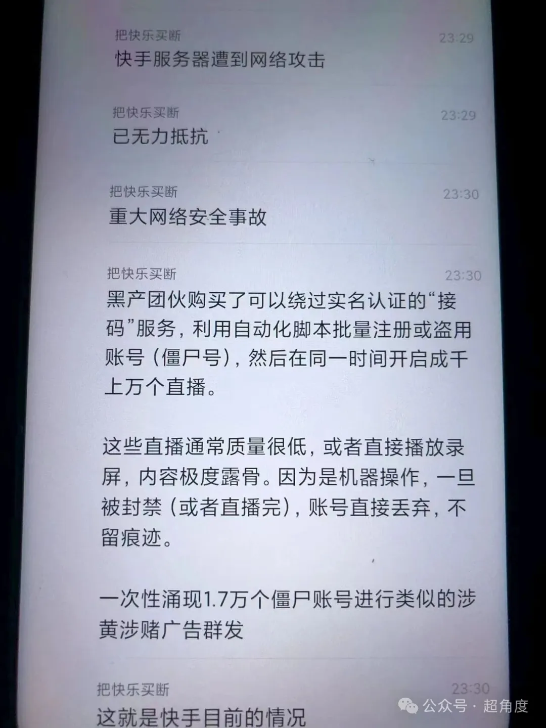 有网友分析称,黑产团伙购买了可以绕过实名认证的"接码"服务,利用自动化脚本批量注册或盗用账号(僵尸号),然后在同一时间开启成千上万个直播。