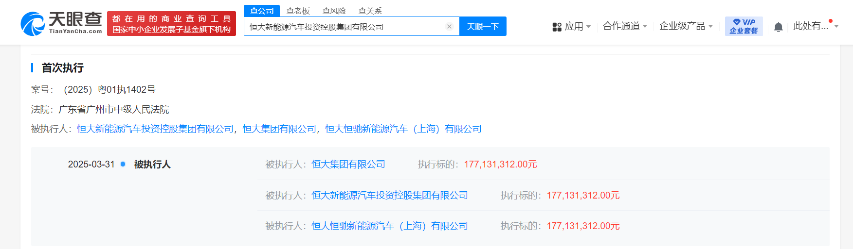 天眼查法律诉讼信息显示,3月31日,恒大新能源汽车投资控股集团有限公司新增2条被执行人信息,执行标的合计2.8亿余元,涉及融资租赁合同纠纷案件,被执行人还包括恒大集团有限公司、恒大恒驰新能源汽车(上海)有限公司等,执行法院为广东省广州市中级人民法院。