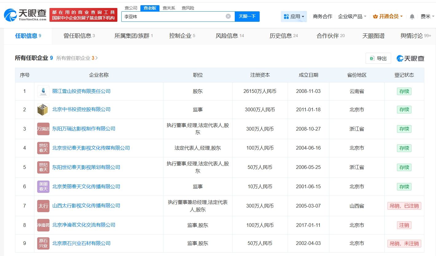 李亚炜名下关联9家企业,其中6家为存续状态,包括北京中书投资控股有限公司、东阳万瑞达影视制作有限公司等,李亚炜在上述企业担任监事、执行董事等职务。合作伙伴关系信息显示,李亚鹏与李亚炜共同关联4家企业,分别是东阳世纪春天影视策划有限公司、丽江雪山投资有限责任公司、北京世纪春天影视文化传媒有限公司、北京美丽春天文化传播有限公司。