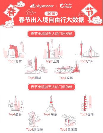 近日,Skyscanner天巡联合携程发布了《2019春节出入境自由行大数据报告》。该数据报告基于Skyscanner天巡与携程的境内外春节出行数据,从旅行者出境及入境情况、春运旅行者行为分析三个维度全方面解读2019年春节期间旅行者出行趋势。《报告》指出,2019年春节期间,北京位居“最热门出发地”榜单第一位;境外游客入境游优先考虑北上广;“反向春运”是今年春运的热门趋势。