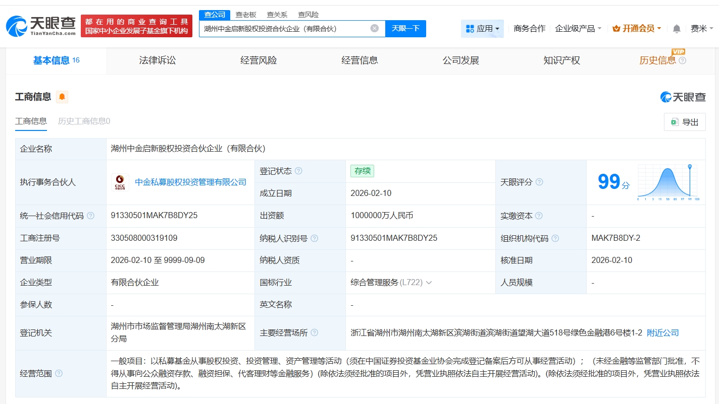 天眼查App显示,近日,湖州中金启新股权投资合伙企业(有限合伙)成立,执行事务合伙人为中金私募股权投资管理有限公司,出资额100亿人民币,经营范围为以私募基金从事股权投资、投资管理、资产管理等活动,由湖州市产业基金投资有限公司、湖州市创新创业投资有限公司、湖州市交通投资集团有限公司等共同出资。